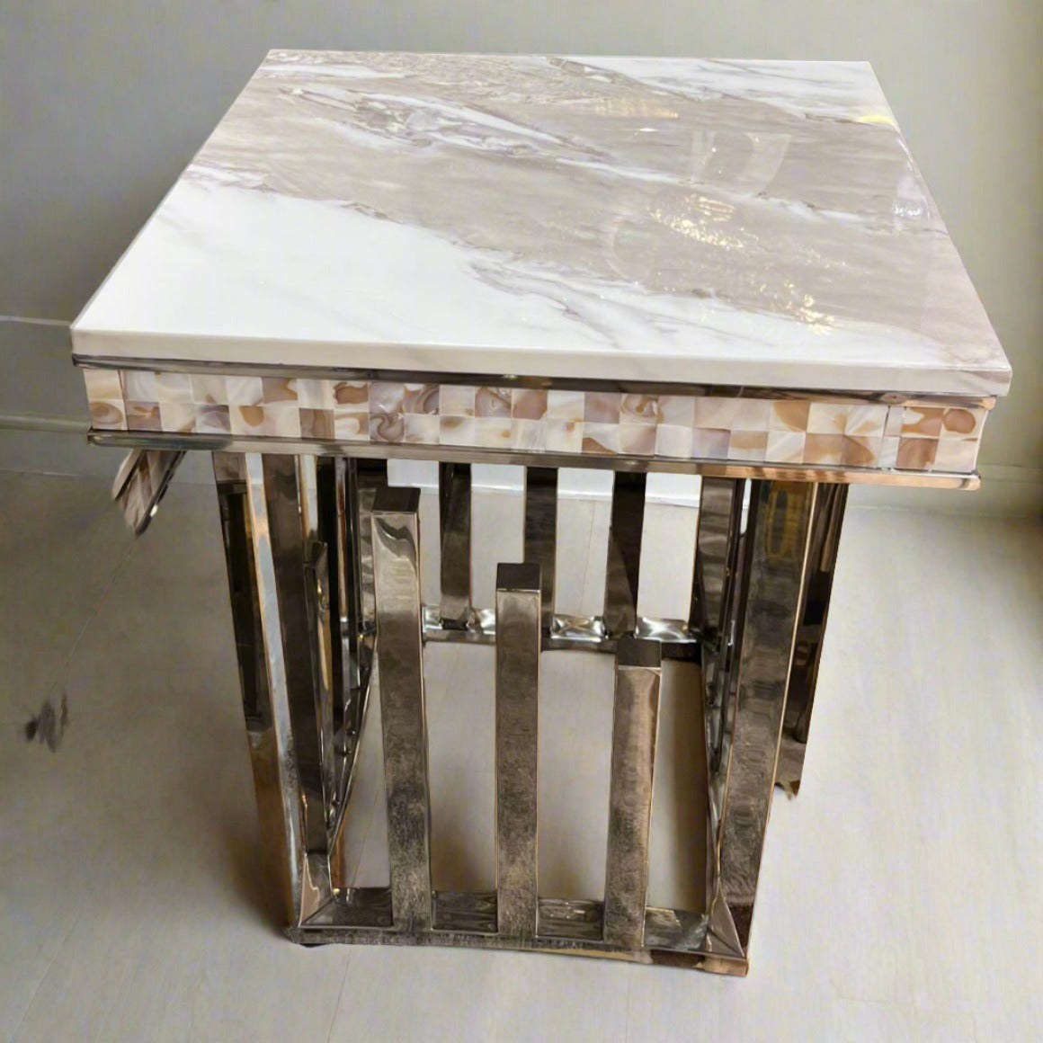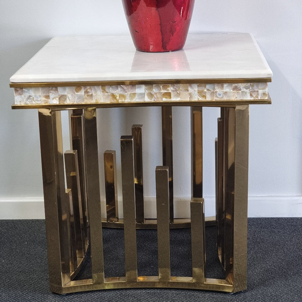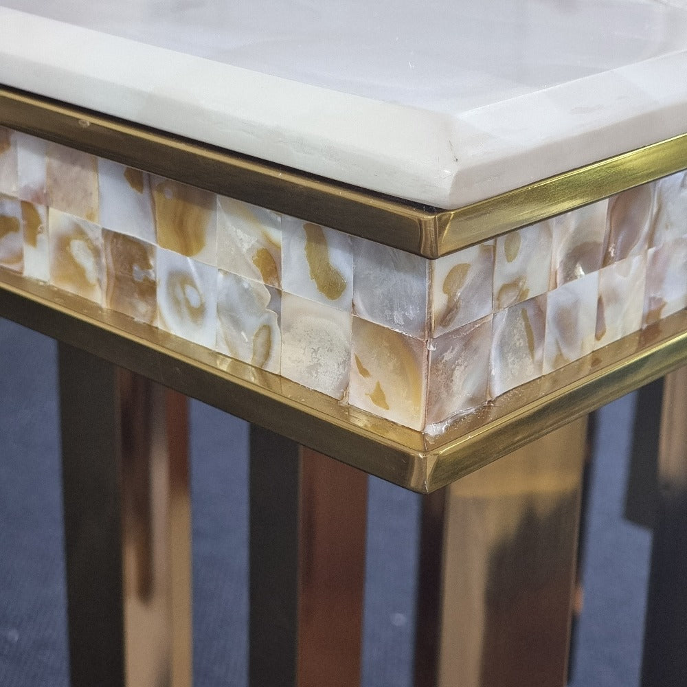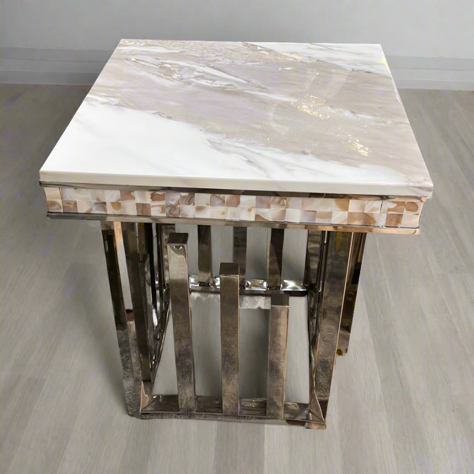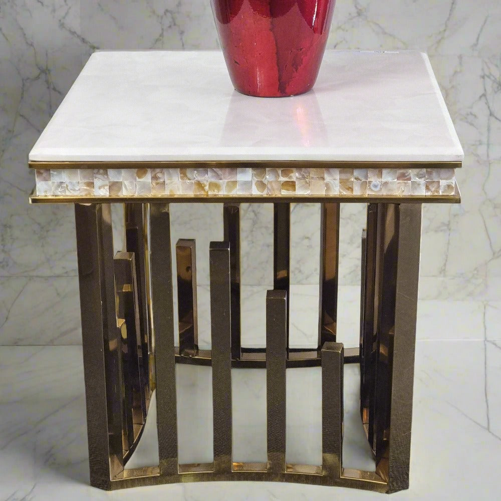 Introducing our classic modern marble top side table, designed with a sleek stainless steel frame in a sophisticated gold finish. Our marble side tables epitomize elegance and simplicity, making them a refined addition to any living space.